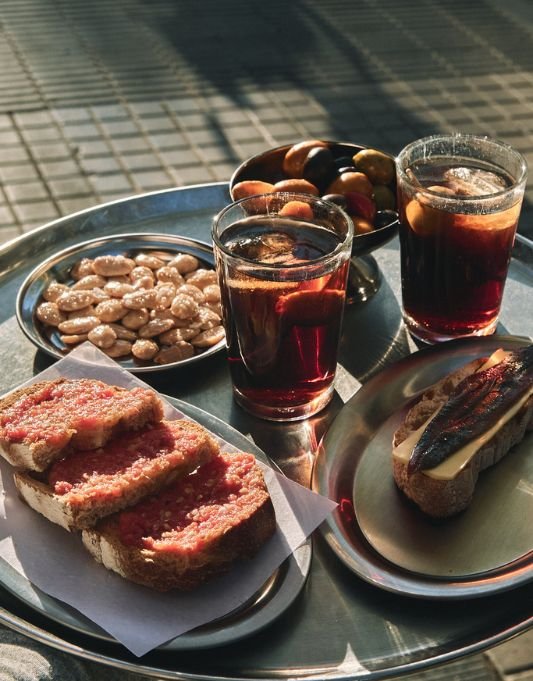 Vermut propio, producto de ultramarinos, alta calidad y muchos platillos para compartir. Todo al centro de la mesa, taburete alto y que empiece el espectáculo.